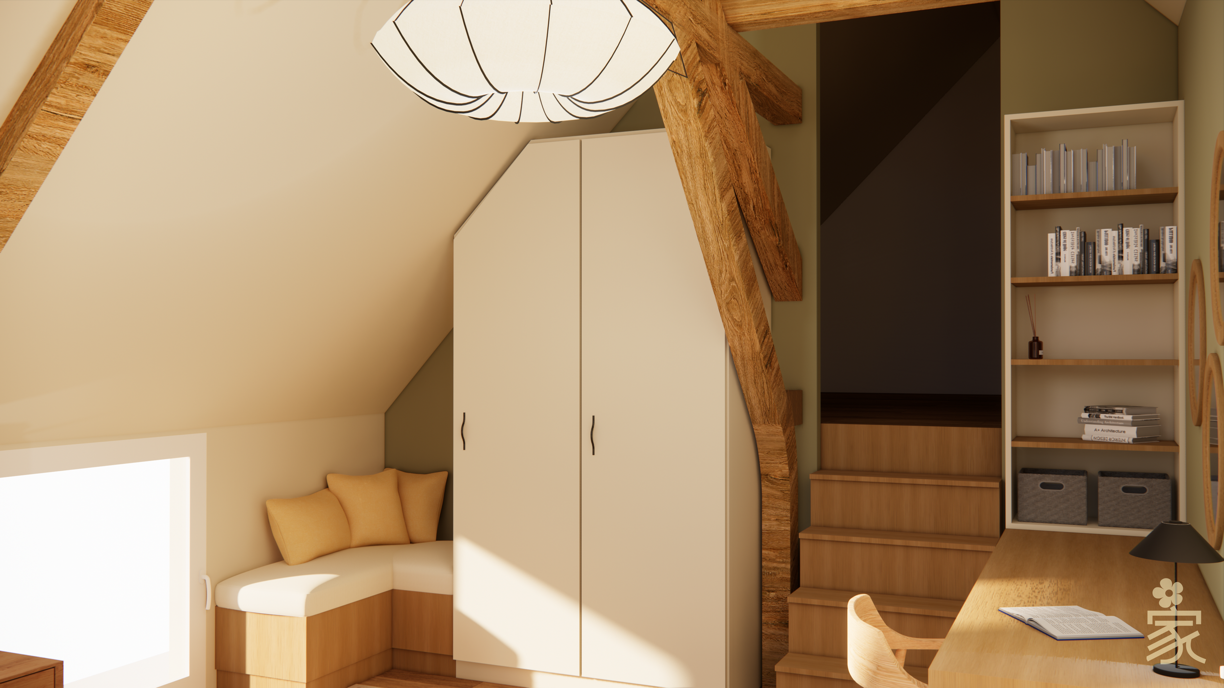 Objectifs : Permettre à mes clients de se projeter dans la future chambre qu’ils aménageront dans les combles. Optimiser l’espace pour créer une chambre d’amis et future chambre enfant fonctionnelle et agréable à vivre tout en s’adaptant aux contraintes existantes.